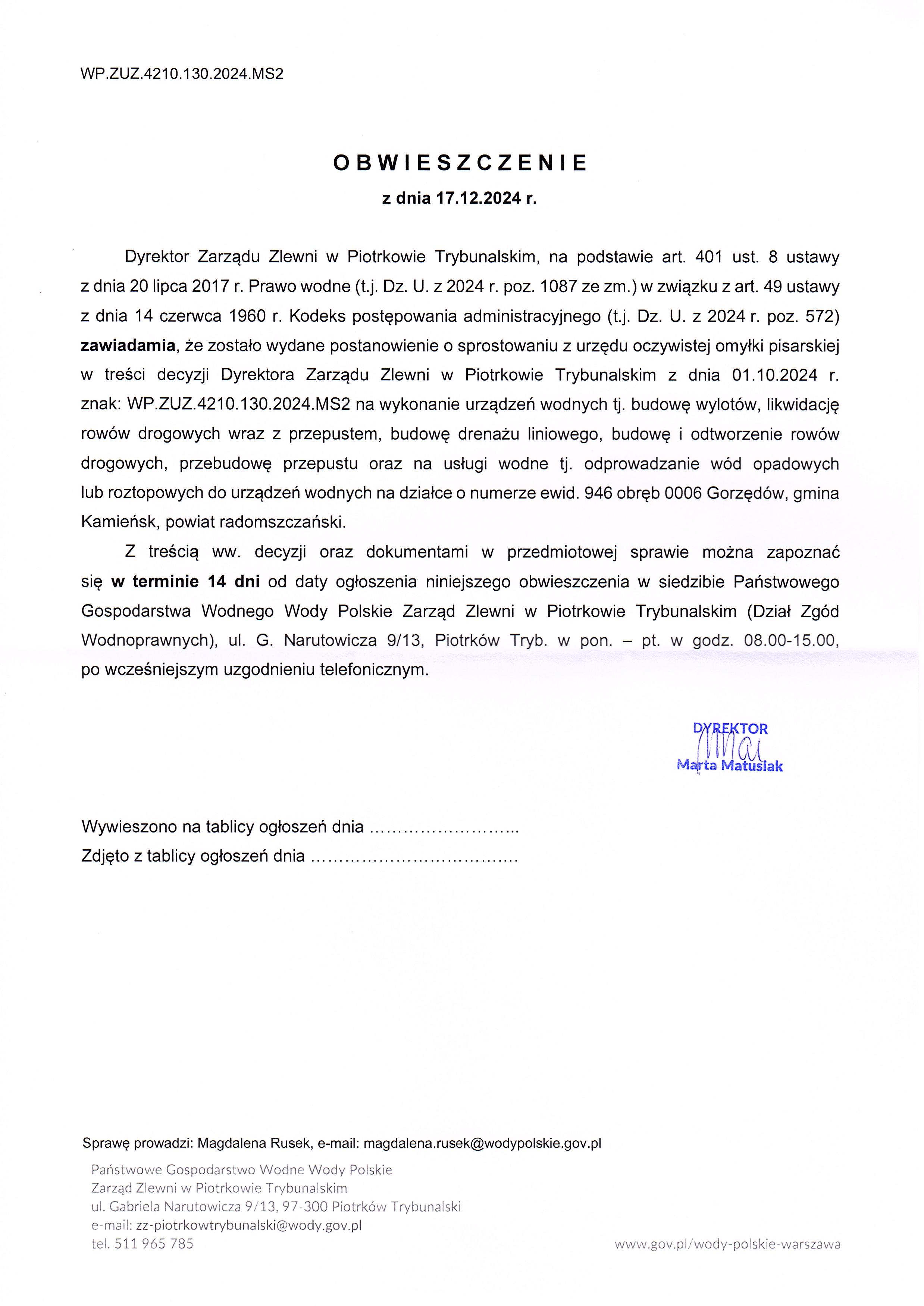 PGW Wody Polskie - Zarządu Zlewni w Piotrkowie Trybunalskim o wydaniu postanowienia o sprostowaniu z urzędu błędu pisarskiego zawartego w pozwoleniu wodnoprawnym z dnia 01.10.2024 r., znak: WP.ZUZ.4210.130.2024.MS2, dotyczącym przebudowy ul. Mickiewicza w Gorzędowie.